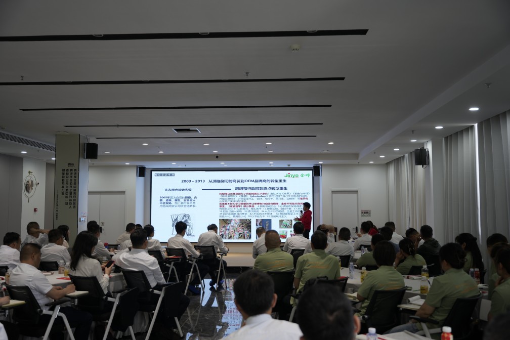 參觀結(jié)束后,眾人齊聚會(huì)議室,參加由金曄食品創(chuàng)始人李金倫主講的學(xué)習(xí)交流會(huì)。在分享中,李總以“回歸原點(diǎn)創(chuàng)造美好”為主題,結(jié)合金曄的成長故事,深入闡釋了企業(yè)如何將稻盛經(jīng)營學(xué)融入日常經(jīng)營,如何把“敬天愛人”的理念落地生根,深入淺出地分析了當(dāng)前食品行業(yè)的發(fā)展趨勢和挑戰(zhàn),并分享了企業(yè)如何在市場競爭中堅(jiān)守初心、不斷創(chuàng)新的重要性。他講到,回歸原點(diǎn)就是回歸簡單純粹和真誠善良,人生和經(jīng)營的成功無非是回歸原點(diǎn)的行動(dòng)。他強(qiáng)調(diào),企業(yè)需將哲學(xué)思維(如稻盛和夫理念)與實(shí)戰(zhàn)管理(如華為流程優(yōu)化)融合,形成獨(dú)特的經(jīng)營體系。他還提出用戶導(dǎo)向,通過“空椅子”機(jī)制讓用戶虛擬參與決策,分歧時(shí)優(yōu)先遵循用戶立場;首創(chuàng)無添加山楂制品,以包裝革新(自立袋、拉鏈設(shè)計(jì))提升體驗(yàn);拆分職能部門為“傳統(tǒng)+現(xiàn)場”雙線,推行阿米巴模式激發(fā)團(tuán)隊(duì)自主性。李總對企業(yè)使命的解讀、對員工關(guān)懷的重視、對讀書學(xué)習(xí)的熱愛和感受,以其豐富的經(jīng)驗(yàn)和獨(dú)到的見解,讓與會(huì)者深受啟發(fā),進(jìn)一步認(rèn)識到企業(yè)文化與價(jià)值觀在企業(yè)發(fā)展中的核心作用。