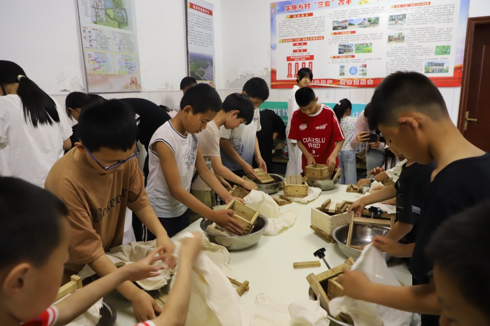 在豆工坊追溯百年匠心傳承,體驗(yàn)非遺石磨工藝。孩子們推動磨把,乳白的豆?jié){緩緩滲出,空氣中漸漸彌漫出清新的豆香。孩子們小心翼翼地將豆花倒入模具,輕輕壓實(shí)。等待脫模時,每個孩子都充滿期待。當(dāng)孩子們打開模具,看著自己親手制作的豆腐,臉上洋溢著自豪的笑容。