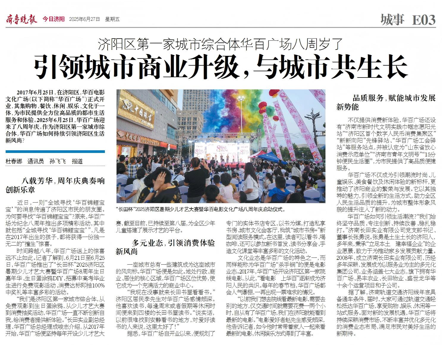 2017年6月25日,在濟陽區(qū),華百電影文化廣場(以下簡稱“華百廣場”)正式開業(yè),其集購物、餐飲、休閑、娛樂、文化于一體,為市民提供全方位高品質(zhì)的都市生活服務(wù)和體驗。2025年6月25日,華百廣場迎來了八周年慶。作為濟陽區(qū)第一家城市綜合體,華百廣場如何持續(xù)引領(lǐng)濟陽區(qū)生活新風尚?