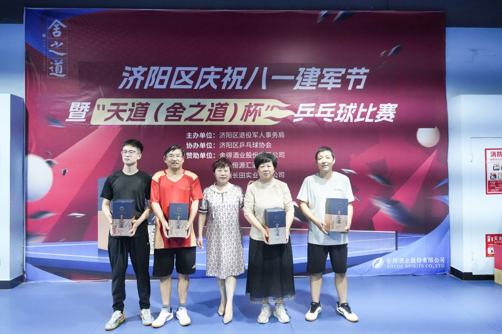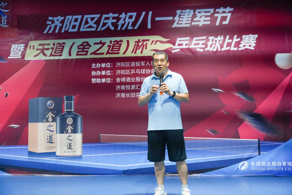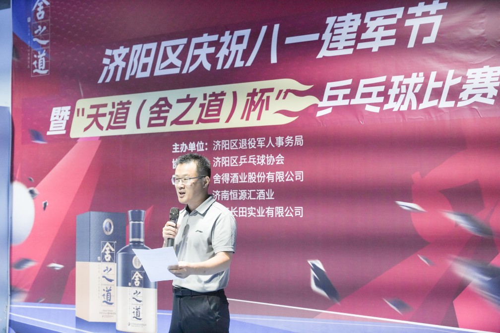 7月27日上午,濟(jì)陽(yáng)區(qū)文化藝術(shù)中心乒乓球館內(nèi)熱鬧非凡,銀球在空中飛速穿梭,喝彩聲此起彼伏。由濟(jì)陽(yáng)區(qū)退役軍人事務(wù)局主辦,區(qū)乒乓球協(xié)會(huì)承辦,濟(jì)南恒匯源酒業(yè)(舍得酒業(yè)股份有限公司)、濟(jì)南長(zhǎng)田實(shí)業(yè)有限公司贊助的“慶祝八一建軍節(jié)暨‘天道 (舍之道) 杯’乒乓球比賽” 在此盛大啟幕。